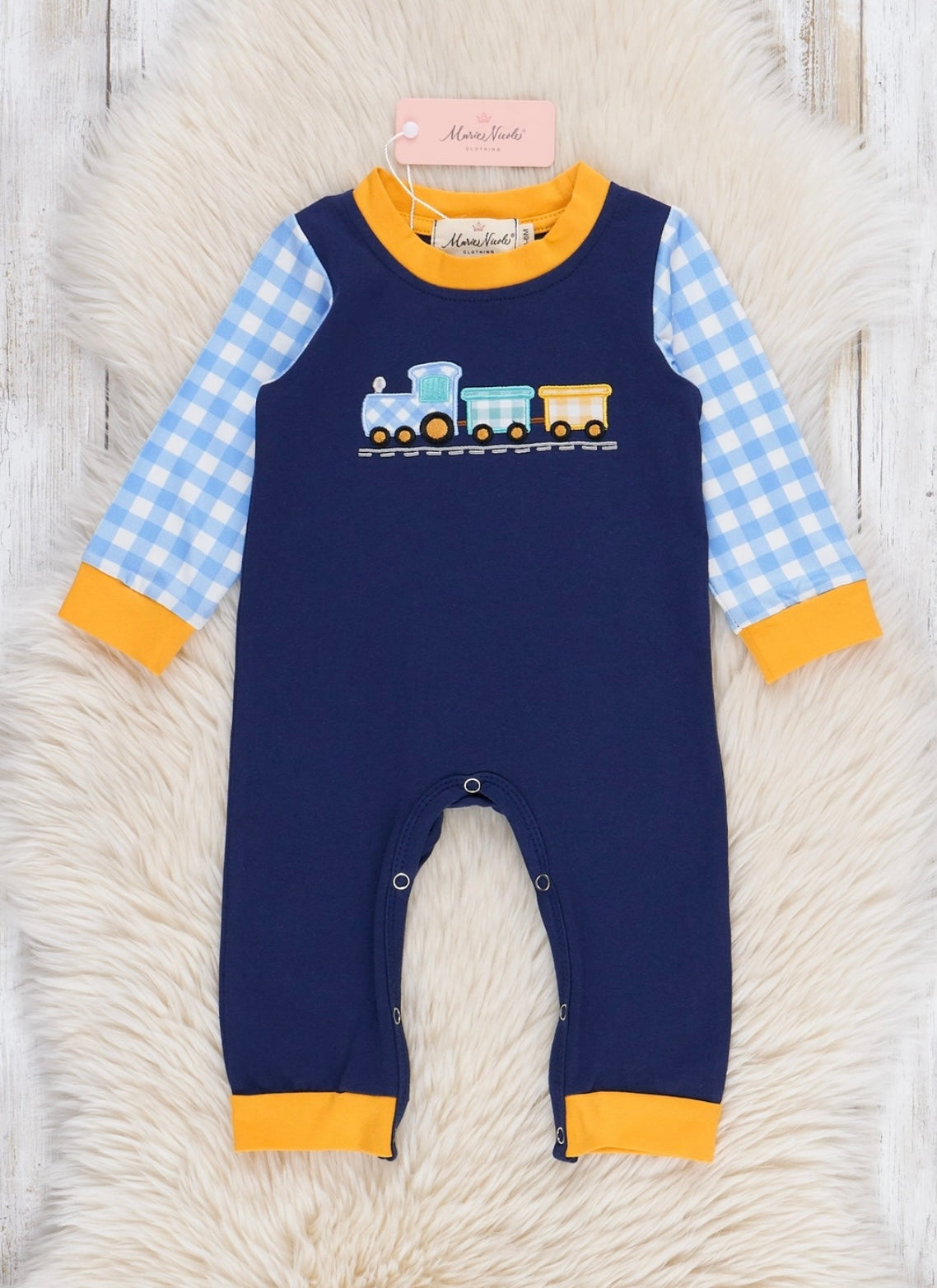 The Little Conductor Gingham Train Romper is a charming and playful look perfect for your little engineer. Featuring classic gingham fabric paired with adorable train embroidery.