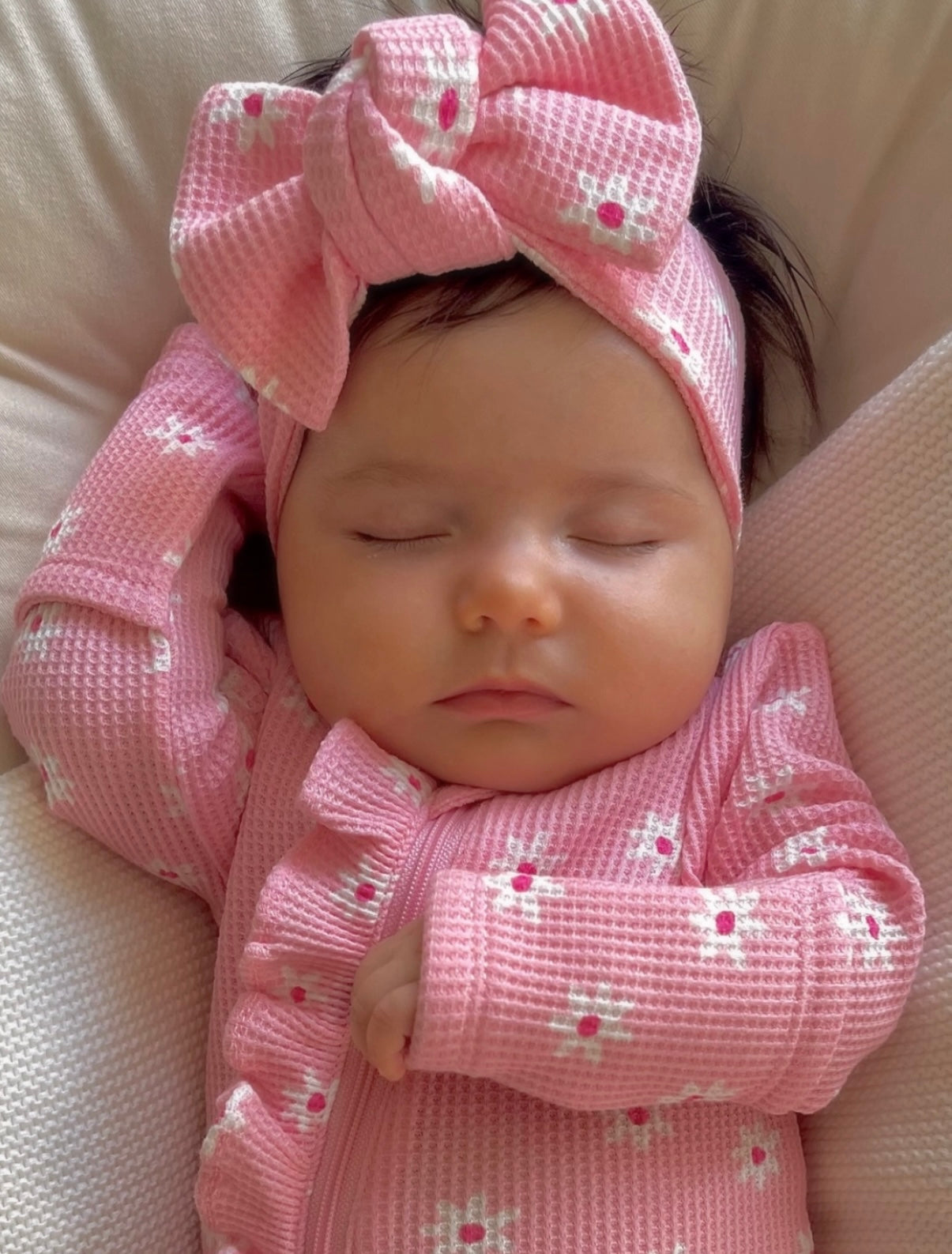 Introducing our Pink Flower Waffle Knot Bow - the sweetest finishing touch for your little one’s outfit. Made from 100% organic cotton with a soft waffle texture, this bow is designed to be both comfortable and adorable. The gentle stretch ensures a secure yet comfy fit, perfect for up to 12 months. Features: * Material: 100% Organic Cotton (soft, breathable, and kind to delicate skin) * Size: Designed to fit 0–12 months * Stretchy & Comfortable: Stays in place without leaving marks * Waffle Texture: Adds a subtle, cozy detail * Eco-friendly: Made with sustainably sourced, organic cotton * Easy Care: Machine washable cold, lay flat to dry Perfect for everyday wear, photoshoots, or special occasions, this Pink Flower Waffle Knot Bow adds a touch of charm to any look.