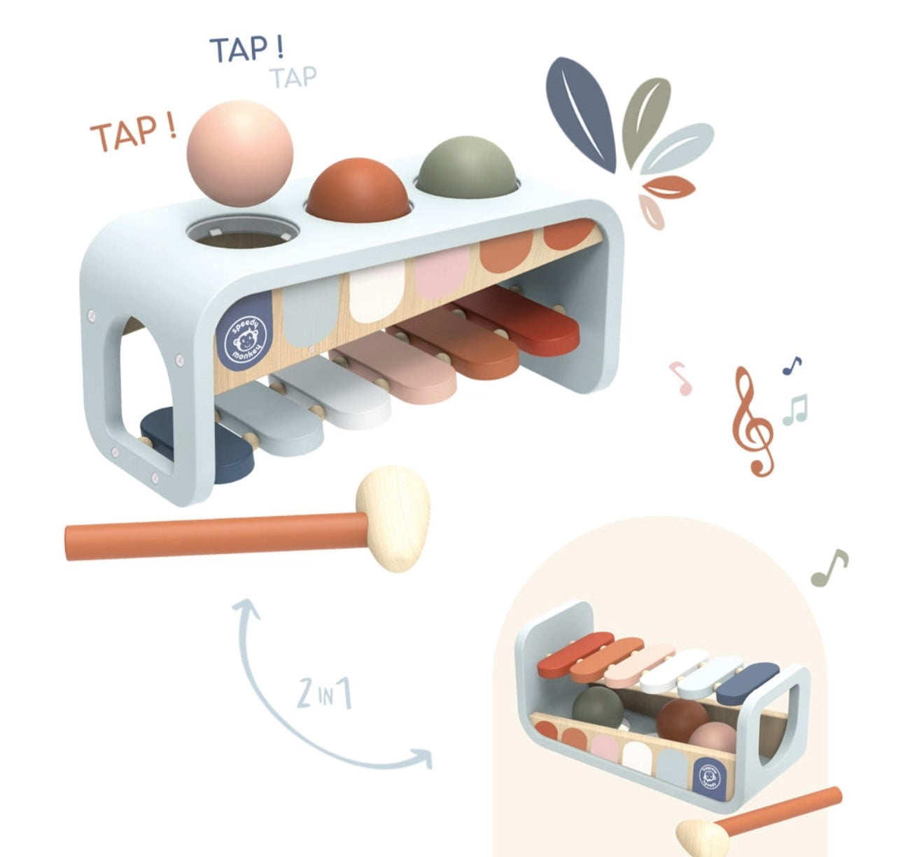 This all wooden Xylo "bench" 2 in 1 is colorful, durable and safe with no rough or sharp edges. It includes three balls which your little one can hammer down into the slots and slide on the wooden xylophone under. This fun toy helps your toddler acquire logic, coordination, and cognitive ability. This toy is crafted from sustainably sourced wood from FSC® certified forests. Presented in a beautiful gift box. Specifications Color: multicolor Recommended Age: 12+ months Material: wood Size (inches): L: 10 x W: 4 x H: 5 Weight (lbs): 1,42 Care instructions: Clean only with a damp cloth. Do not use detergents.